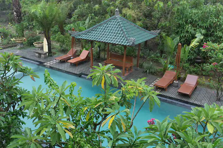 Bask in the laid-back ambiance, unwind on the patio or balcony, and take advantage of the free parking and round-the-clock access to the shared outdoor pool—a serene oasis open throughout the year. For added convenience, we offer luggage drop-off for those with early arrivals or late departures, ensuring you make the most of your time in this thrilling destination. Extended stays of 28 days or more are also welcomed, allowing guests to fully immerse themselves in the Uluwatu experience.