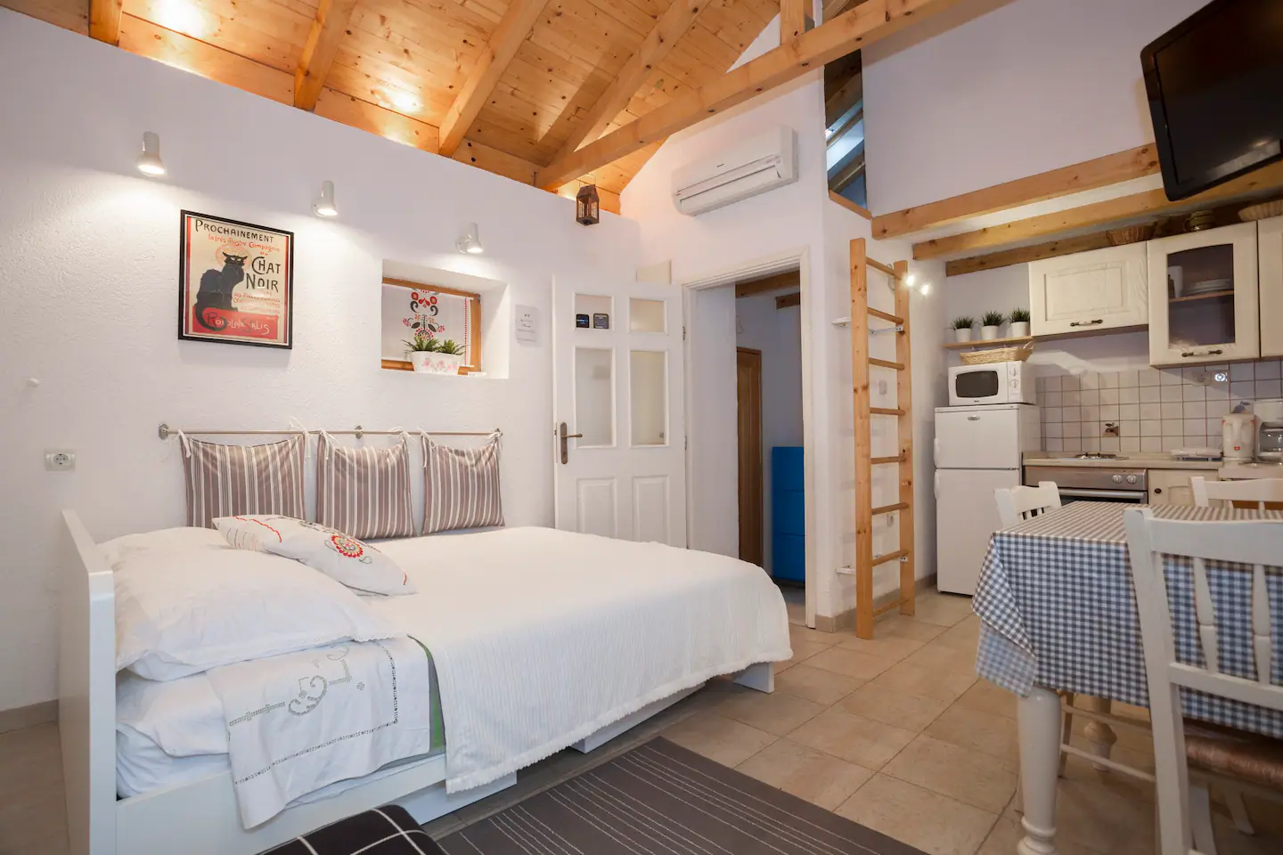 Step into the past as you enter this beautifully preserved Dalmatian stone house. The room, lovingly dubbed the "Stone Room," exudes character and authenticity, immersing guests in the local culture. With modern amenities like air-conditioning, a TV, and a private bathroom complete with a shower and washing machine, your stay promises both comfort and convenience. Soft towels and crisp linens are included, ensuring a restful night's sleep.