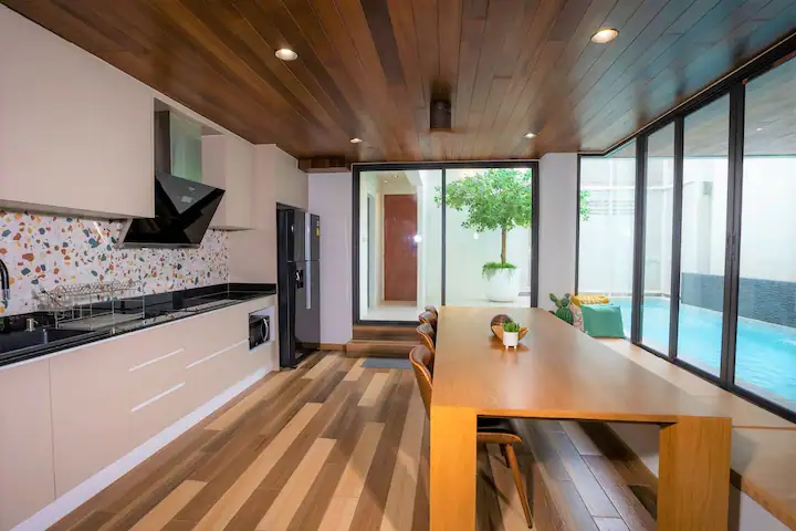 The villa features a private saltwater swimming pool open from 6am to 9pm, perfect for a refreshing dip after a long day exploring the city. The fully-equipped kitchen is stocked with all the appliances and basic supplies you need to whip up delicious meals, while the large living areas with smart TV, YouTube, and Netflix ensure you can relax in comfort.